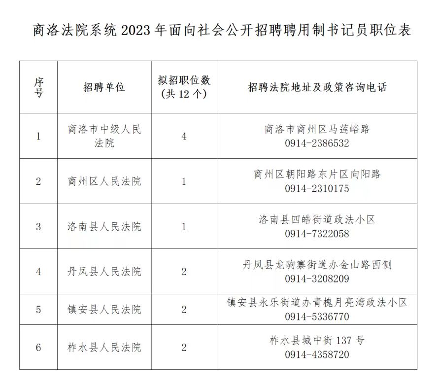 全市法院共招聘聘用制書記員12名,各法院招聘職位、地址及政策咨詢電話詳見(jiàn)《商洛法院系統(tǒng)2023年面向社會(huì)公開招聘聘用制書記員職位表》(附件)。